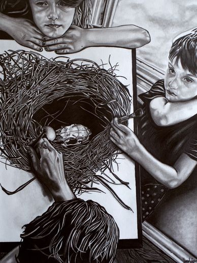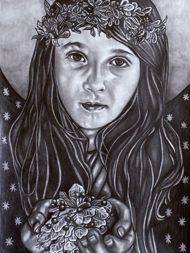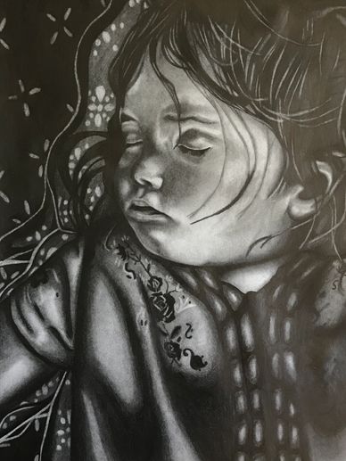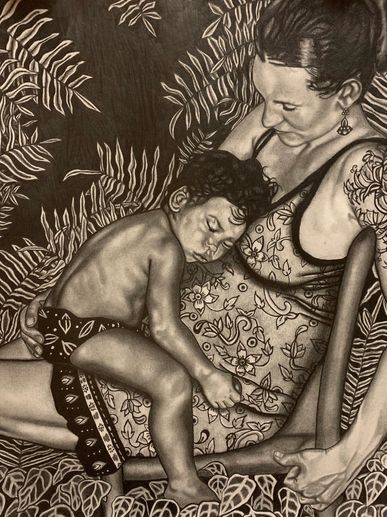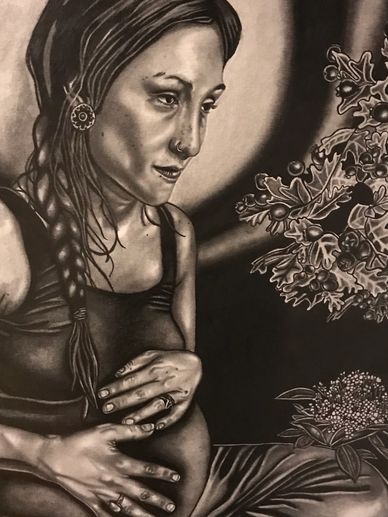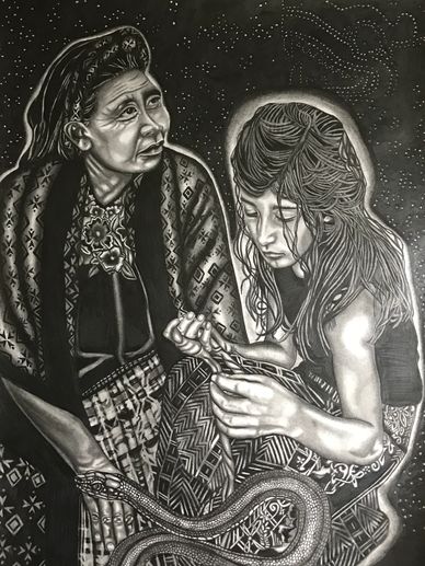 "Pictured here is my fore-mother. Surrounding her are the vines of Atropa Belladonna, representing the inter-connectedness of the matrilineal lines of the women healers that came before her, mirroring the veins that map my very body which are the reservoirs of the wisdom, knowledge and trauma of my ancestors.