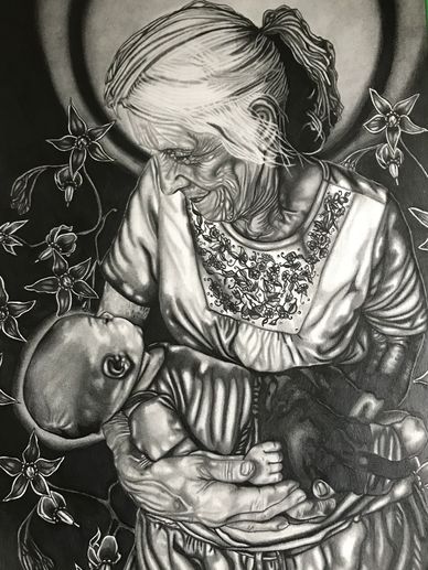 As the Matriarch of our family, my grandmother unknowingly blesses my fourth born with her very presence. Her face is riddled with the lines of wisdom that speak of her time upon this earth; enduring a life outside of matriarchal balance while having had her innate ability to heal those around her severed. Yet now, as both crone and elder, the wisdom of my ancestors is within full bloom. The moon illuminates this peaceful embrace which transmits the love of previous generations while grounding this new life to the regenerative powers of the earth, to which she is slowly returning to."